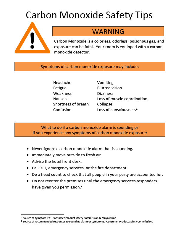 WARNING - Carbon Monoxide is a colorless, odorless, poisonous gas, and exposure can be fatal. Your room is equipped with a carbon monoxide detector.