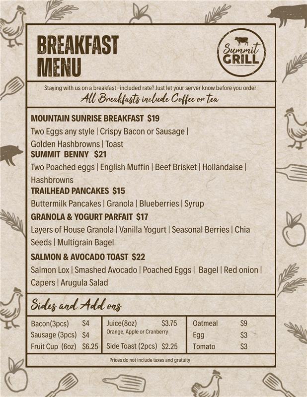 Start your morning at the Summit Grill with fresh, hearty flavours just steps from your room. Enjoy eggs with crispy bacon, rich brisket bennies, or salmon avocado toast with coffee included. Every plate is made to fuel your day in Valemount, warm, satisfying, and perfectly local.